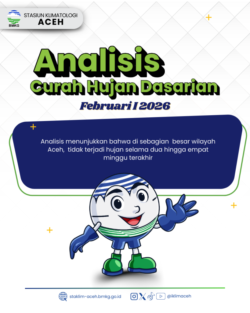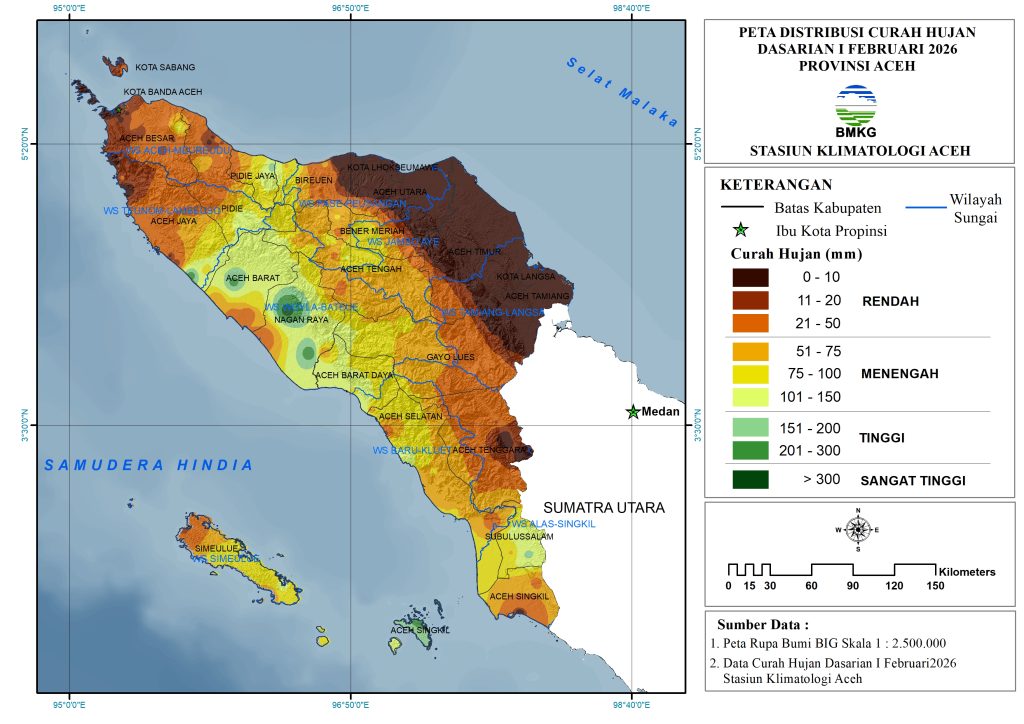 Distribusi Curah Hujan Dasarian I Februari 2026 menunjukkan bahwa sebagian besar wilayah Provinsi Aceh (53% pos hujan) didominasi curah hujan kategori rendah (0β50 mm/dasarian) yang mencakup seluruh wilayah Kota Lhokseumawe, Aceh Utara, Aceh Timur, Kota Langsa, Aceh Tamiang serta sebagian wilayah Kota Sabang, Aceh Besar, Aceh Jaya, Bireuen, Bener Meriah, Gayo Lues dan Aceh Tenggara.