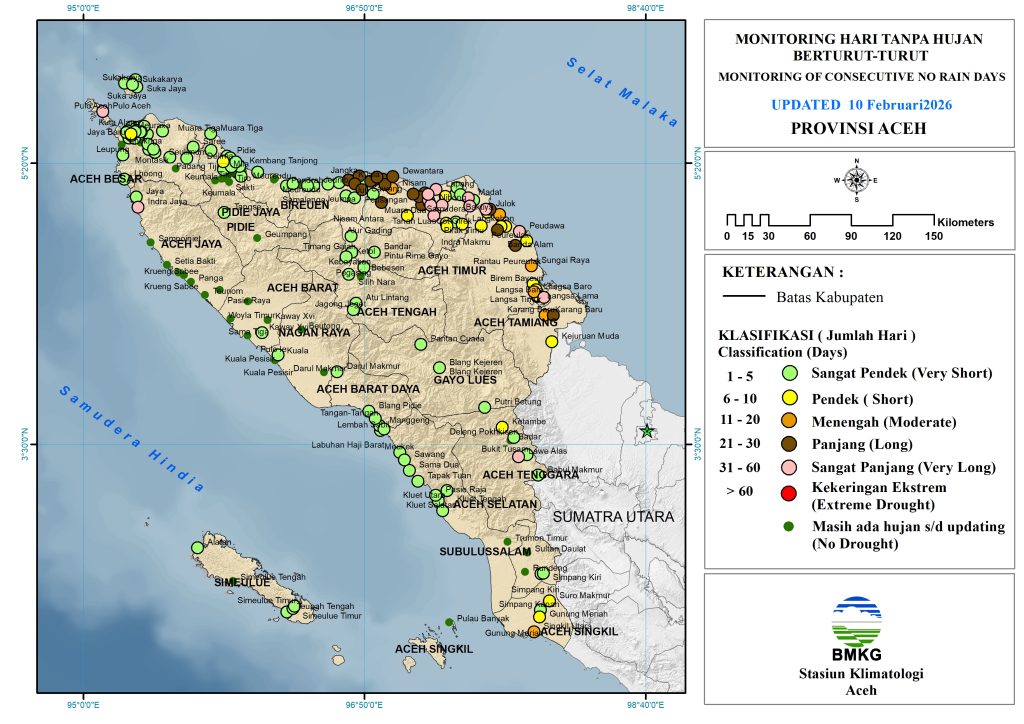 Berdasarkan pembaruan data per 10 Februari 2026 dari 208 titik pengamatan curah hujan, kondisi Hari Tanpa Hujan (HTH) di Provinsi Aceh didominasi kategori Sangat Pendek (1β5 hari) mencakup 49% pos hujan. HTH kategori Pendek (0 – 5 hari) hanya terjadi 10% dan HTH kategori Menengah (11 – 20 hari) terjadi pada 3% pos hujan. Sementara itu pada 10% pos hujan terjadi HTH kategori Panjang (21 – 30 hari) dan pada 7% pos hujan terjadi HTH kategori Sangat Panjang (31 – 60 hari). HTH sangat panjang terjadi terutama di sebagian besar wilayah Aceh Timur dan Aceh Utara, serta sebagian Aceh Besar, Aceh Tenggara, Kota Langsa dan Aceh Jaya. Selain itu, sebanyak 21% pos hujan mengalami hujan hingga update hari ini. Analisis ini menunjukkan bahwa di sebagian besar wilayah Aceh, tidak terjadi hujan selama dua hingga empat minggu terakhir.