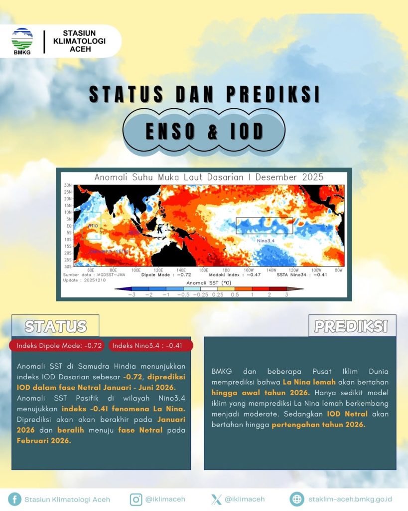 - Prediksi: IOD diprediksi berada dalam fase Netral mulai Januari hingga Juni 2026.