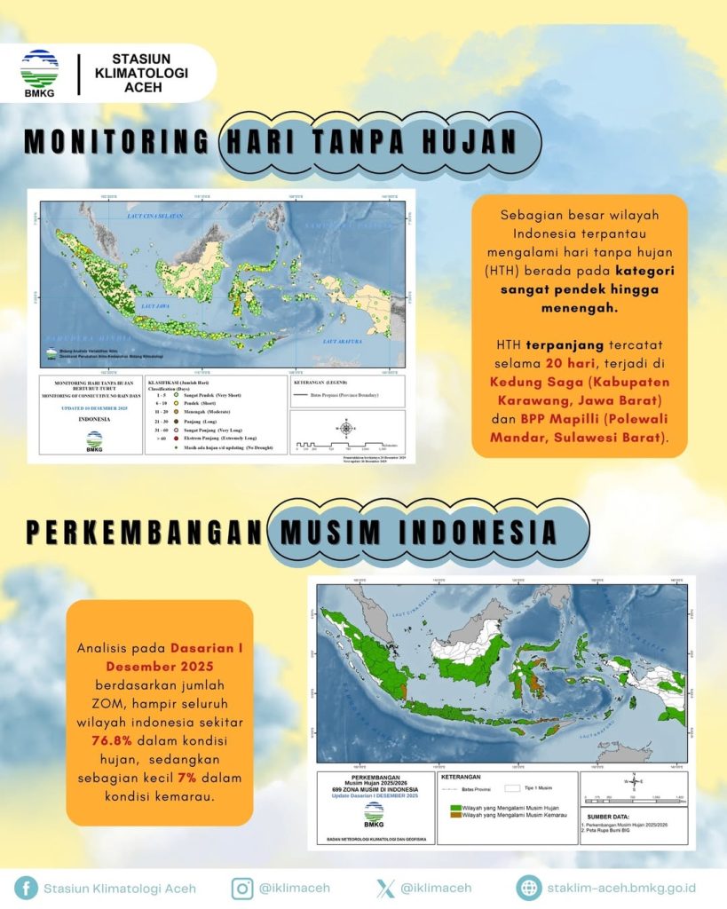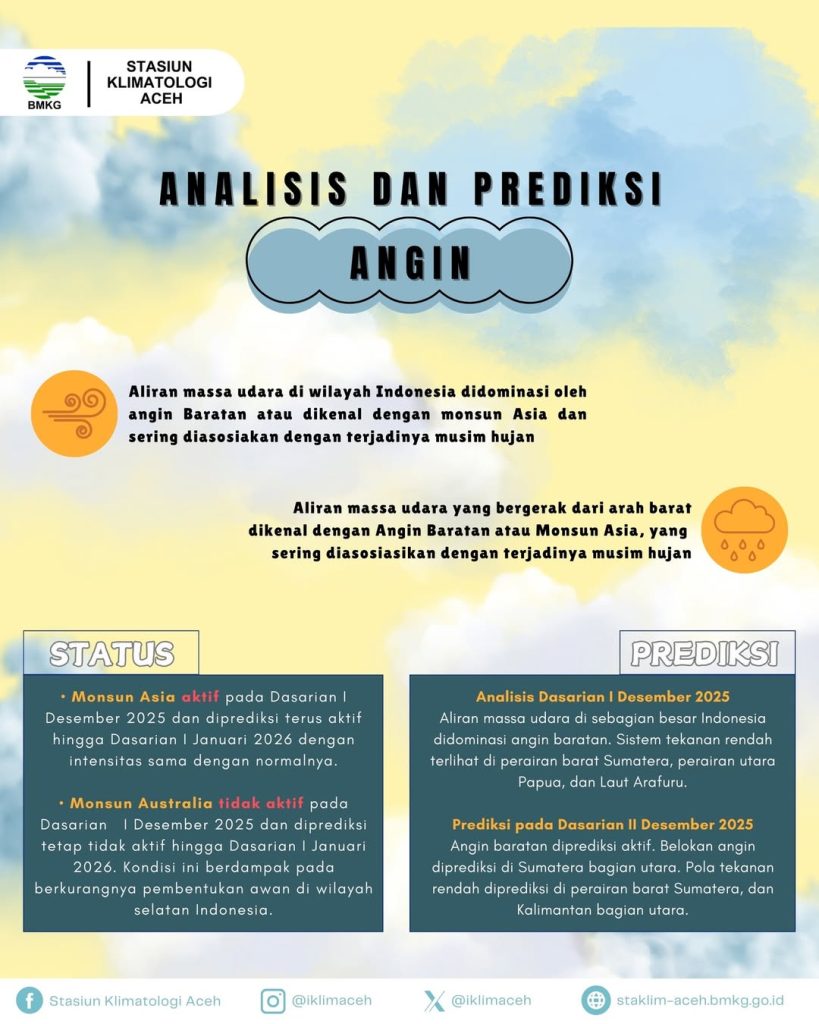 Peningkatan Kewaspadaan: Mengingat prediksi aktifnya Angin Baratan dan belokan angin di Sumatera bagian utara pada Dasarian II Desember 2025, masyarakat di wilayah Aceh diimbau untuk meningkatkan kewaspadaan terhadap potensi bencana hidrometeorologis seperti banjir, longsor, dan angin kencang.Pantau terus informasi prakiraan cuaca dan iklim serta peringatan dini melalui media resmi BMKG.