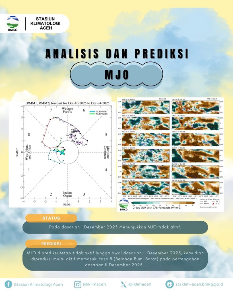 - Prediksi: MJO diprediksi tetap tidak aktif hingga awal Dasarian II Desember 2025. Kemudian, MJO diprediksi mulai aktif memasuki fase 8 (Belahan Bumi Barat) pada pertengahan Dasarian II Desember 2025.