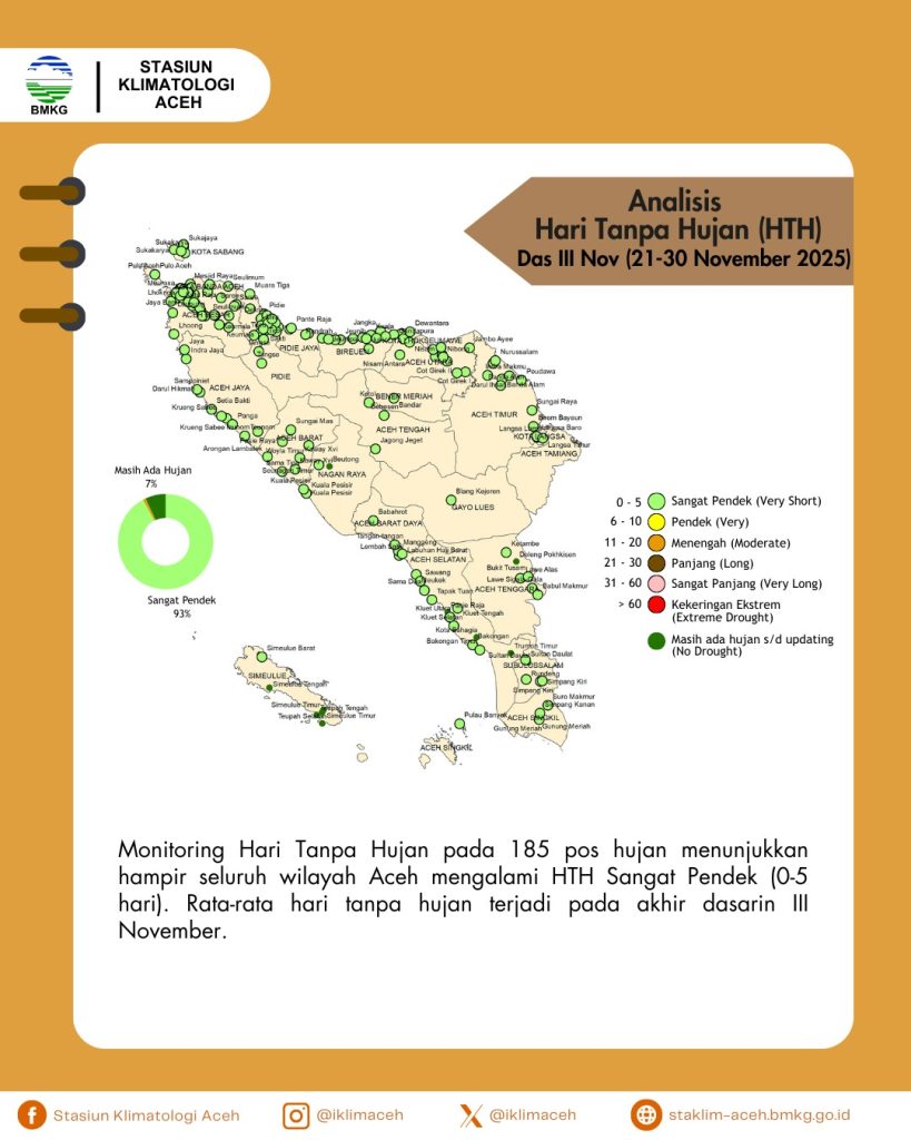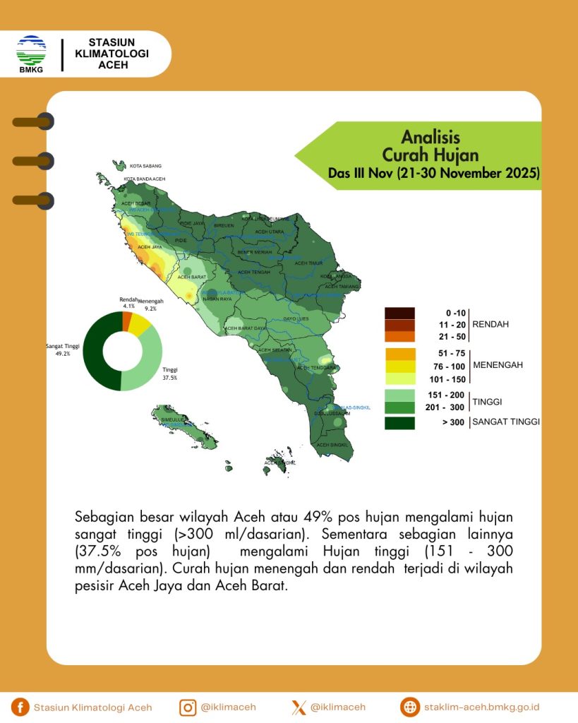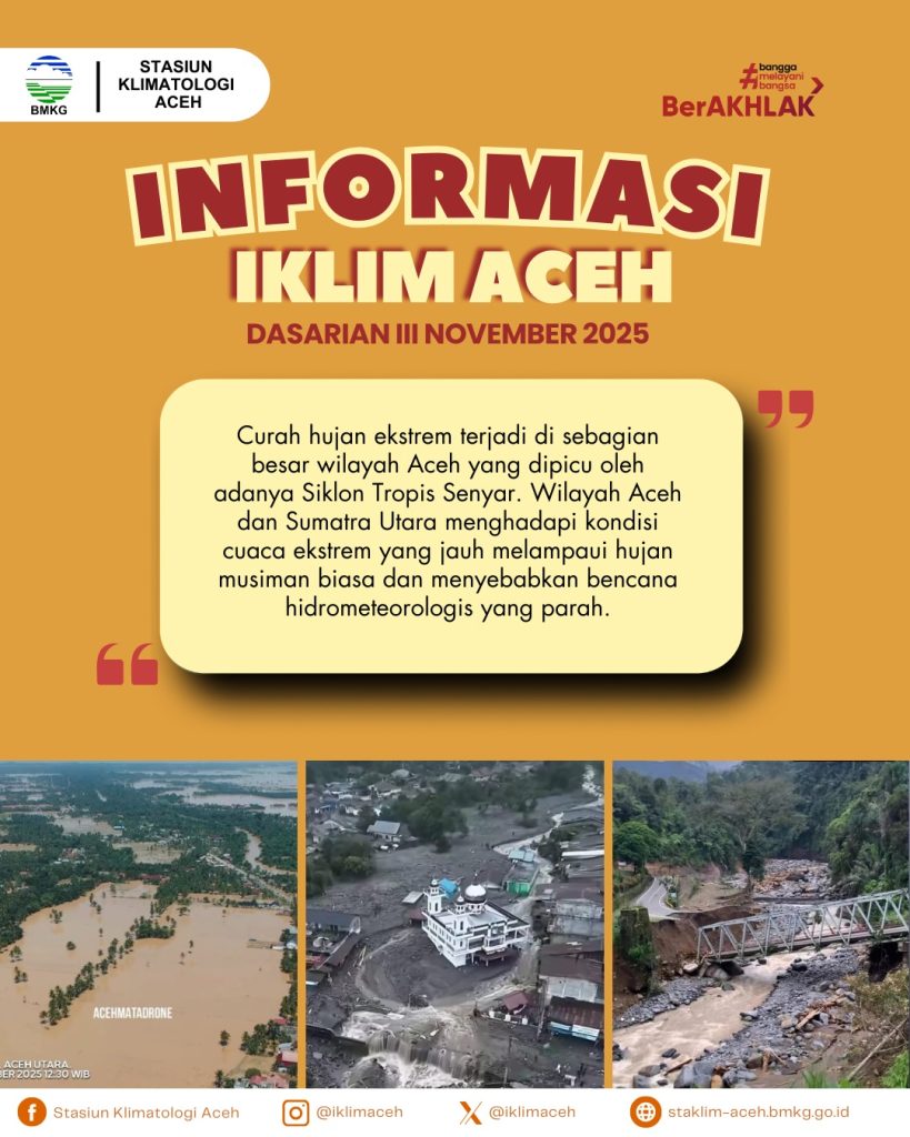 Aceh menghadapi kondisi cuaca ekstrem! Kami sampaikan analisis Iklim untuk Dasarian III November 2025 dan prediksi Curah Hujan untuk Dasarian I Desember 2025.Analisis Dasarian III November 2025 (21-30 November):