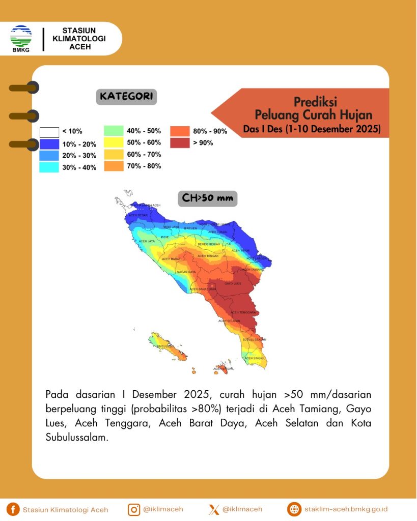 • Peluang Curah Hujan Tinggi (>80%): Curah hujan >50 mm/dasarian berpeluang tinggi di Aceh Tamiang, Gayo Lues, Aceh Tenggara, Aceh Barat Daya, Aceh Selatan, dan Kota Subulussalam.