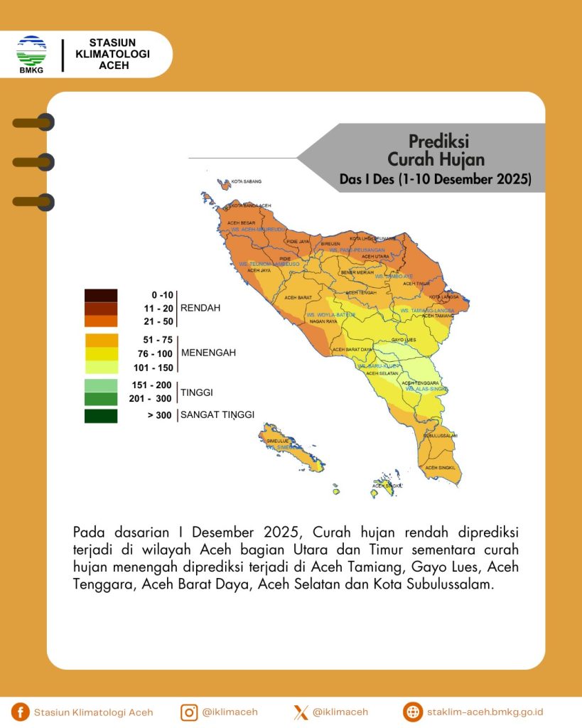 • Curah Hujan Prediksi: Curah hujan menengah diprediksi terjadi di Aceh Tamiang, Gayo Lues, Aceh Tenggara, Aceh Barat Daya, Aceh Selatan, dan Kota Subulussalam. Curah hujan rendah diprediksi di wilayah Aceh bagian Utara dan Timur.