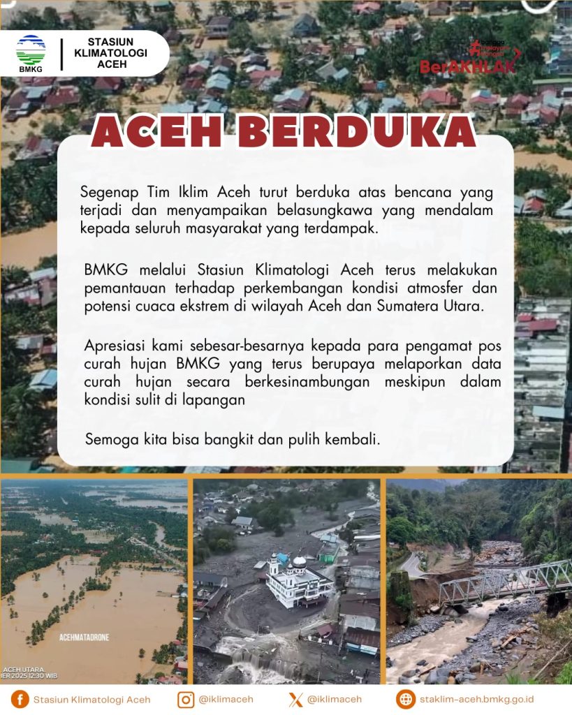 Segenap Tim Iklim Aceh turut berduka atas bencana yang terjadi dan menyampaikan belasungkawa yang mendalam kepada seluruh masyarakat yang terdampak.BMKG melalui Stasiun Klimatologi Aceh terus melakukan pemantauan terhadap perkembangan kondisi atmosfer dan potensi cuaca ekstrem di wilayah Aceh dan Sumatera Utara. Mari tingkatkan kewaspadaan dan semoga kita bisa bangkit dan pulih kembali.