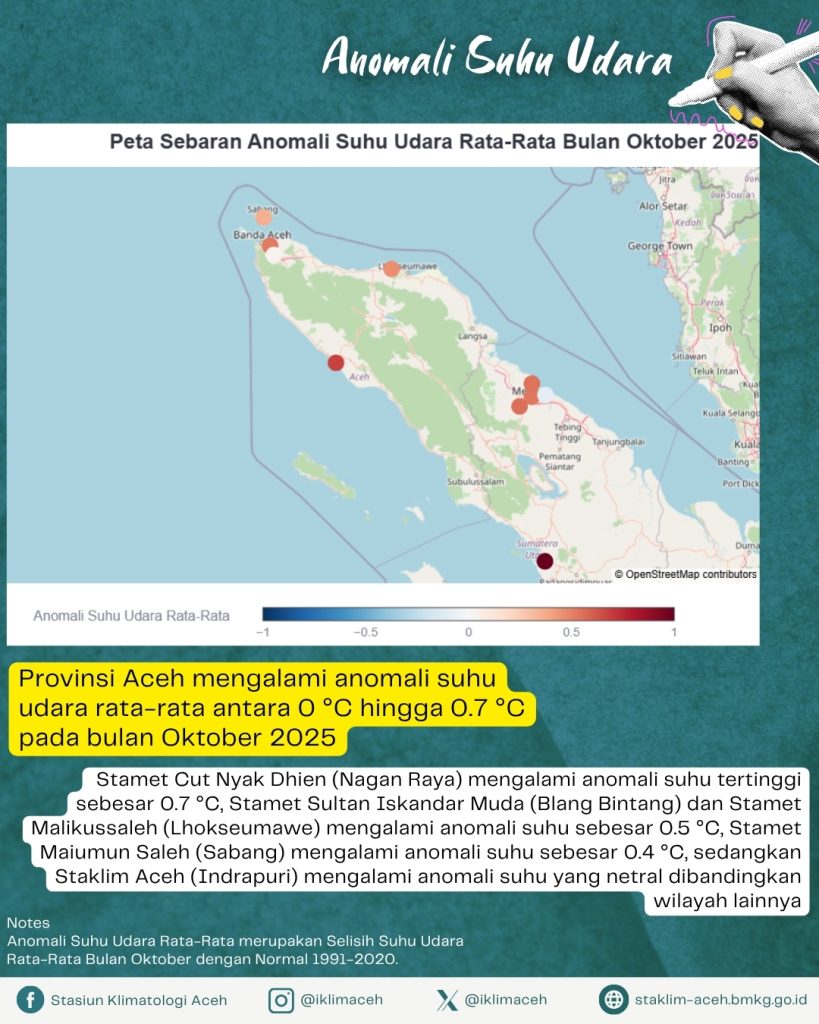 - Provinsi Aceh mengalami anomali suhu udara rata-rata antara 0 ℃ hingga 0.7℃ pada bulan Oktober 2025.