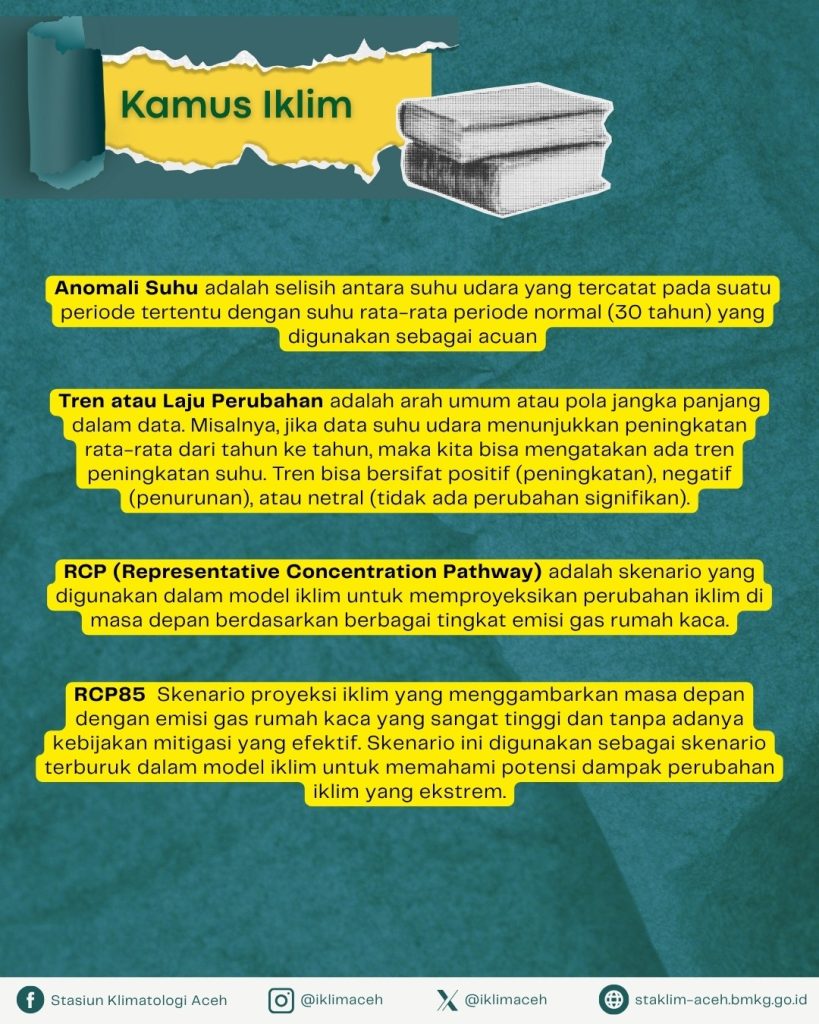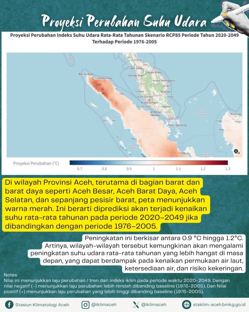 - Diprediksi terjadi kenaikan suhu rata-rata tahunan di wilayah Provinsi Aceh, terutama di bagian barat dan barat daya (seperti Aceh Besar, Aceh Barat Daya, Aceh Selatan, dan sepanjang pesisir barat).