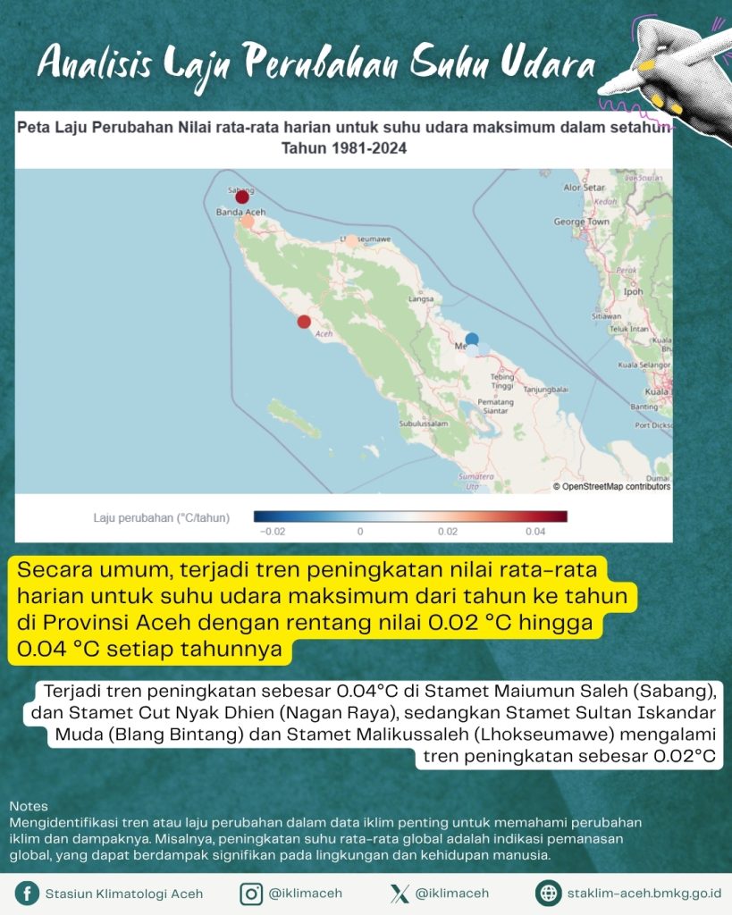- Stamet Sultan Iskandar Muda (Blang Bintang) dan Stamet Malikussaleh (Lhokseumawe) mengalami tren peningkatan sebesar 0.02℃.