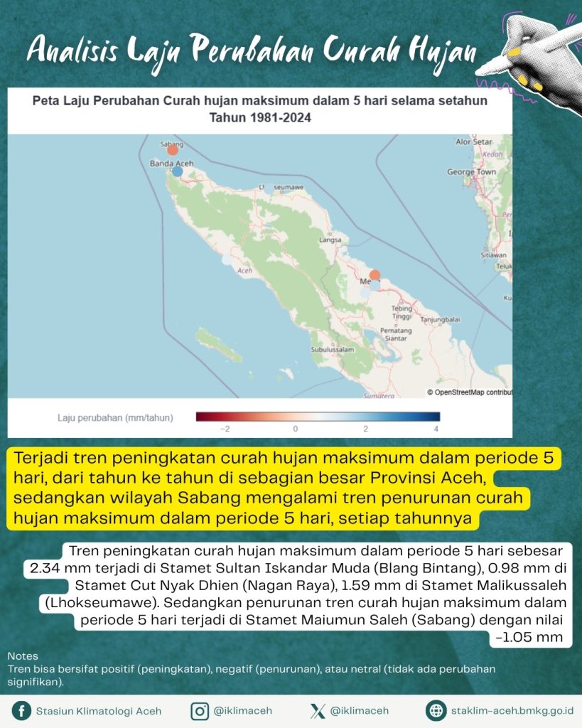 - Sebagian besar Provinsi Aceh mengalami tren peningkatan curah hujan maksimum dalam periode 5 hari, sedangkan wilayah Sabang mengalami tren penurunan.