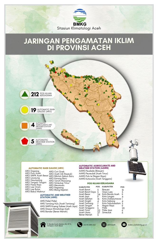 Jaringan pengamatan iklim di Provinsi Aceh mencakup total 212 Pos Hujan, termasuk 19 Pos Hujan Kerjasama. Pos Hujan Kerjasama ini tersebar di berbagai kabupaten/kota dengan jumlah terbanyak di Kota Banda Aceh (39 pos), Aceh Tengah (47 pos), Pidie (27 pos), dan Pidie Jaya (26 pos).