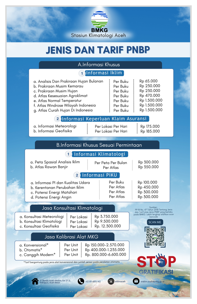 Stasiun Klimatologi Aceh menerima permintaan data dan informasi yang termasuk kedalam PNBP. Hal ini diatur dalam PP RI No. 47 Tahun 2018 tentang Jenis dan Tarif atas Jenis PNBP yang berlaku pada BMKG, mencakup beberapa kategori utama.