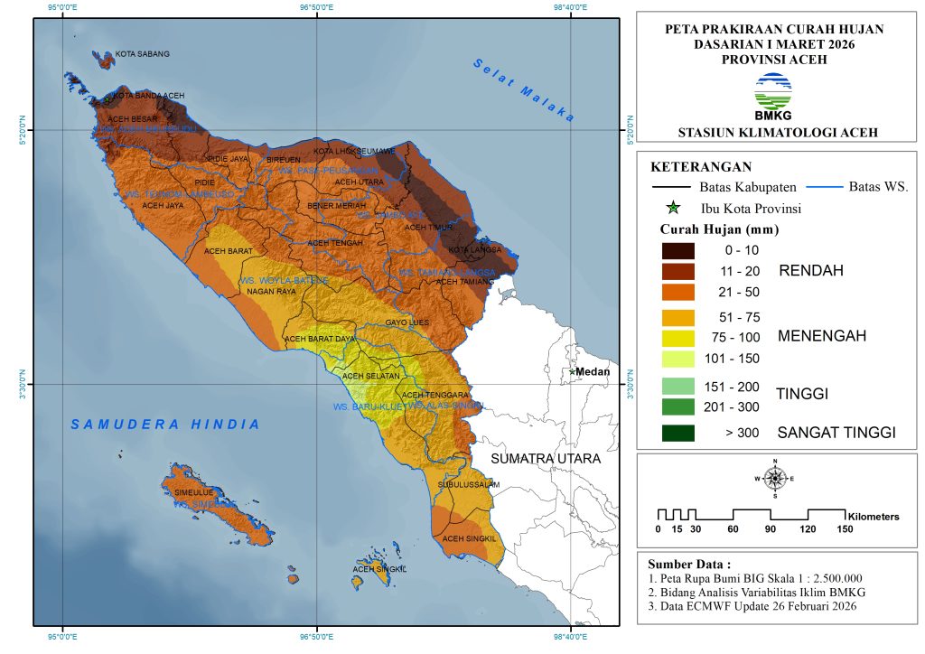 Secara umu, sebagian besar wilayah Provinsi Aceh diprakirakan mengalami CH kategori Rendah (0-50 mm/dasarian). CH kategori Menengah (51 – 150 mm/dasarian) diprakirakan terjadi di sebagian wilayah Aceh Barat, sebagian besar Nagan Raya, Aceh Barat Daya, sebagian kecil Aceh Tengah, sebagian Gayo Lues, sebagian besar Aceh Tenggara, sebagian besar Subulussalam dan sebagian Aceh Singkil.