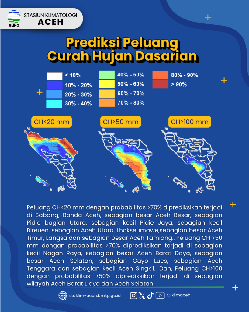 Peluang CH <20 mm dengan probabilitas >70% diprakirakan terjadi di Sabang, Banda Aceh, sebagian besar Aceh Besar, sebagian Pidie bagian Utara, sebagian kecil Pidie Jaya, sebagian kecil Bireuen, sebagian Aceh Utara, Lhokseumawe,sebagian besar Aceh Timur, Langsa dan sebagian besar Aceh Tamiang.