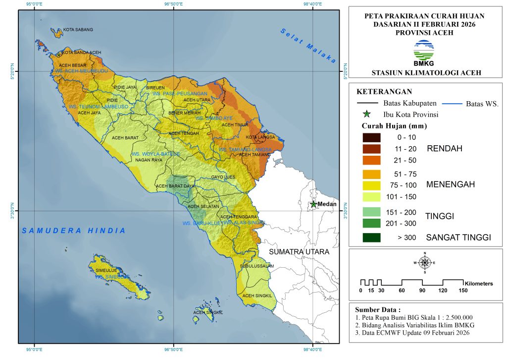 Secara umum, sebagian besar Provinsi Aceh diprediksi akan mengalami curah hujan kategori Menengah (51 – 150 mm/dasarian). Terdapat juga sebagian kecil wilayah yang akan mengalami curah hujan Rendah (21-50 mm/dasarian) yang akan terjadi di bagian utara hingga timur Provinsi Aceh (Aceh Tamiang, Kota Langsa, Aceh Timur, Aceh Utara, Pidie) serta Pulau Aceh. Curah hujan Tinggi (151-200 mm/dasarian) diprediksi akan terjadi di sebagian pesisir Barat-Selatan Aceh (Aceh Barat Daya, Aceh Selatan), dan Gayo Lues.