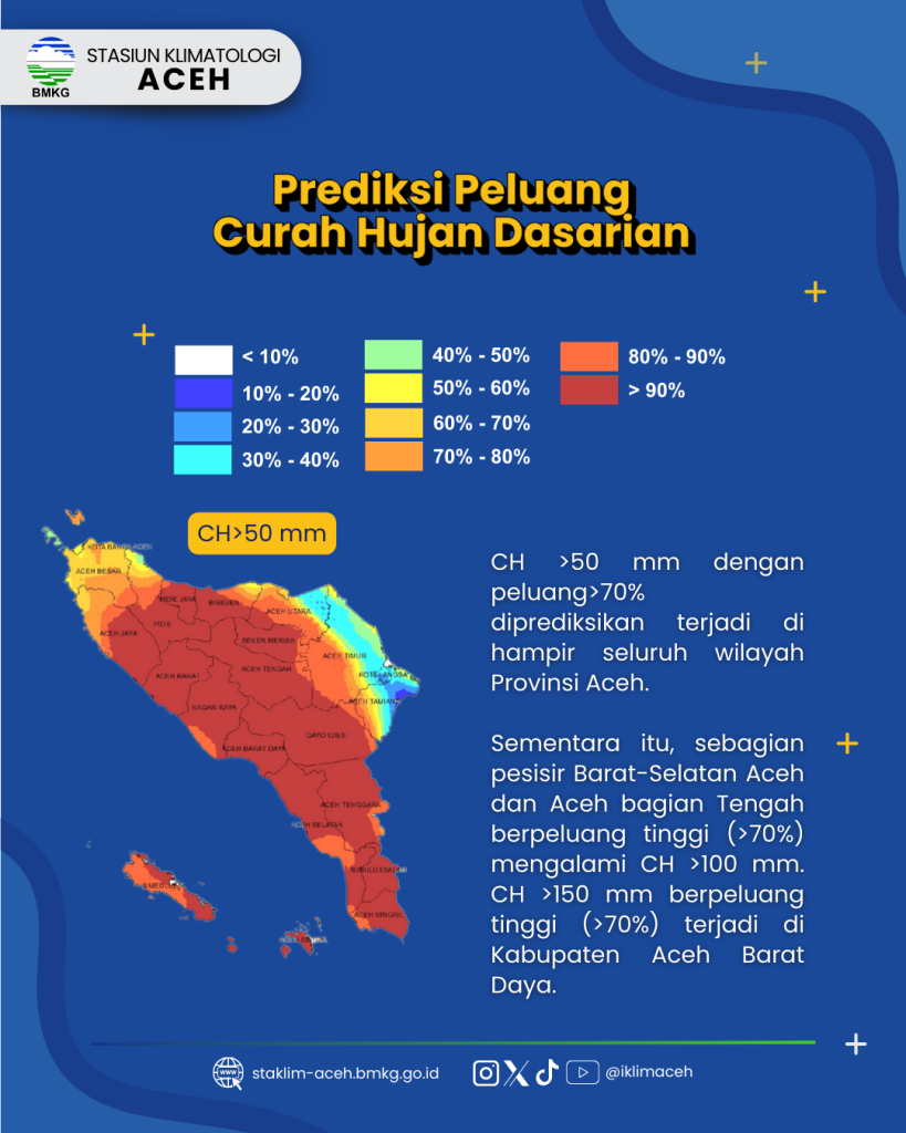 Peluang CH >50 mm dengan probabilitas >70% diprediksikan terjadi di  hampir seluruh wilayah Provinsi Aceh, kecuali di Barat Laut Provinsi Aceh dan pesisir Utara-Timur Aceh. Selain itu, Peluang CH>100 dengan probabilitas >70% diprediksikan terjadi di sebagian pesisir Barat-Selatan Aceh dan Aceh bagian Tengah. Peluang CH >150 mm dengan probabilitas >70% diprediksikan terjadi di Kabupaten Aceh Barat Daya.